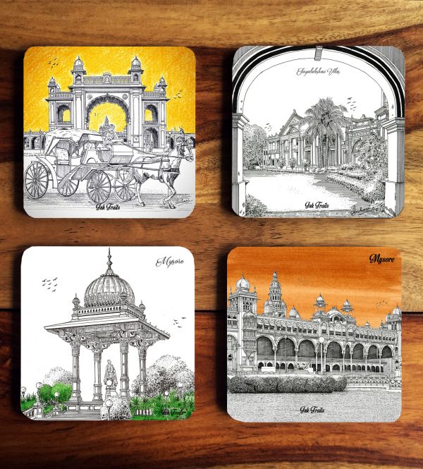 The Mysore set comes as a set of 4 with a cork board backing. It is laminated on top, therefore it is water resistant and can be wiped clean and it comes packaged in a beautiful vintage box. This series of artworks is an ode to the Heritage of Mysore and make a great addition to one’s decor and also a great gift as a souvenir!