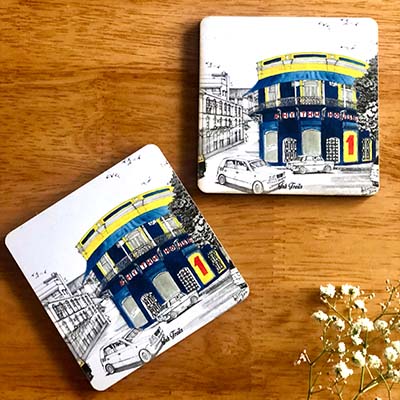 The set of 2 coasters are 3.5″ x 3.5″ and come with a cork board backing.