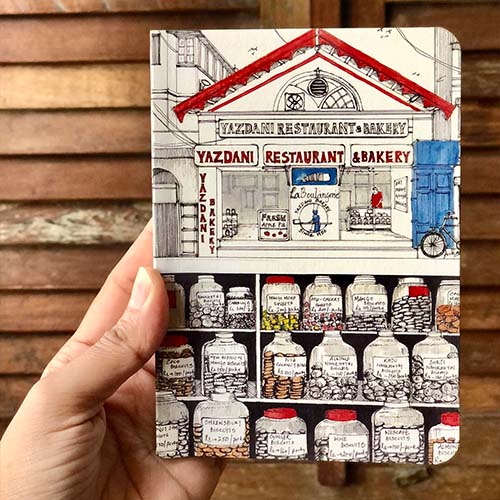 An A6 sized notebook featuring an illustrated front cover dedicated to the Irani Cafes in Bombay. A premium notebook with 180 pages of 90 GSM, its compact in size and great to carry on the go for sketching and jotting down notes and ideas. It also makes a great pocket notebook to plan out your day and work. All designs are made in limited numbers and they make great gifts as a keepsake to remember and treasure memories of Bombay.