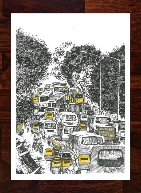 An artwork reminiscing the Bangalore Traffic. An A3 sized artwork printed on a 280 GSM Matt Ivory Paper. All prints come with a plain border for mounting and framing. The prints are wrapped in a brown paper and rolled and shipped in bend-proof cardboard postal tubes.